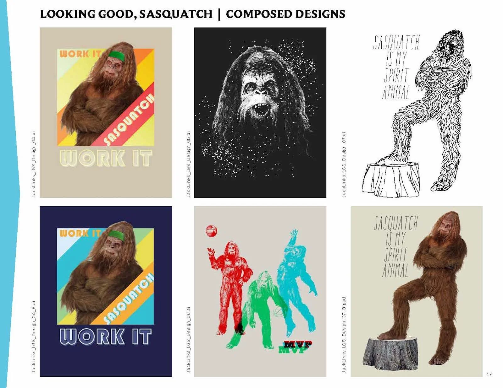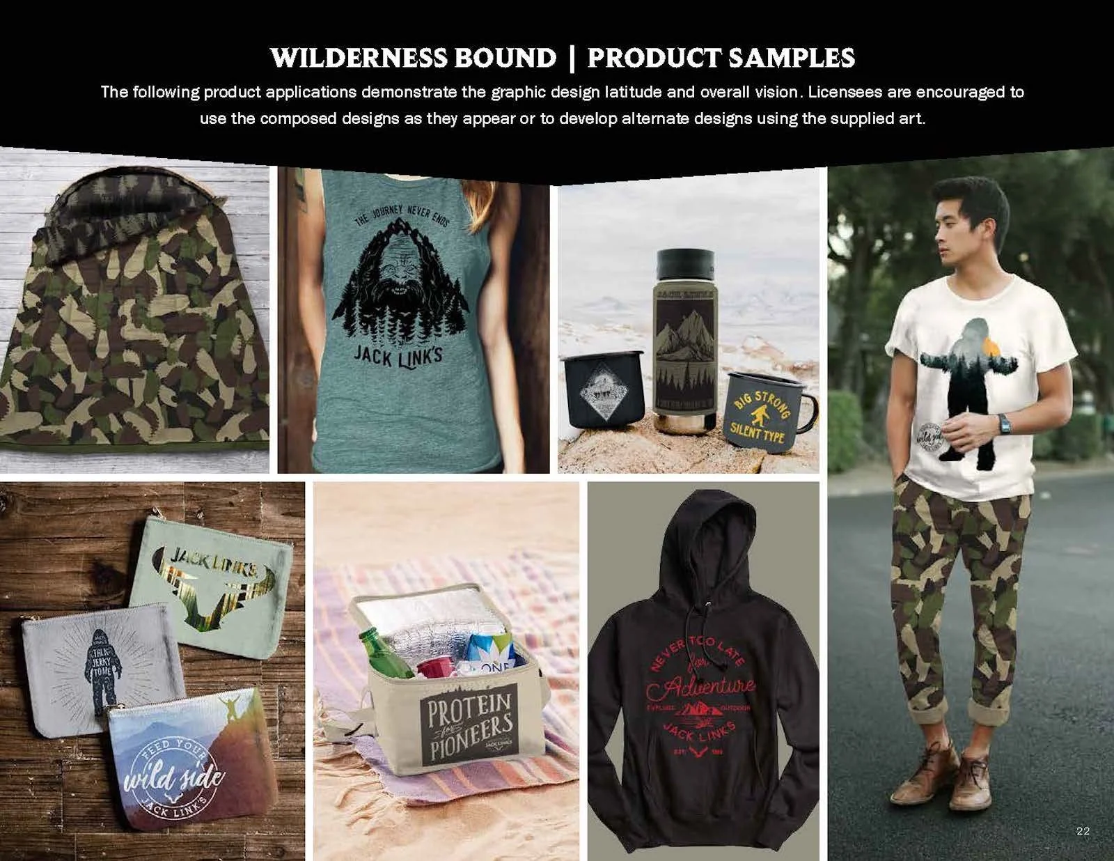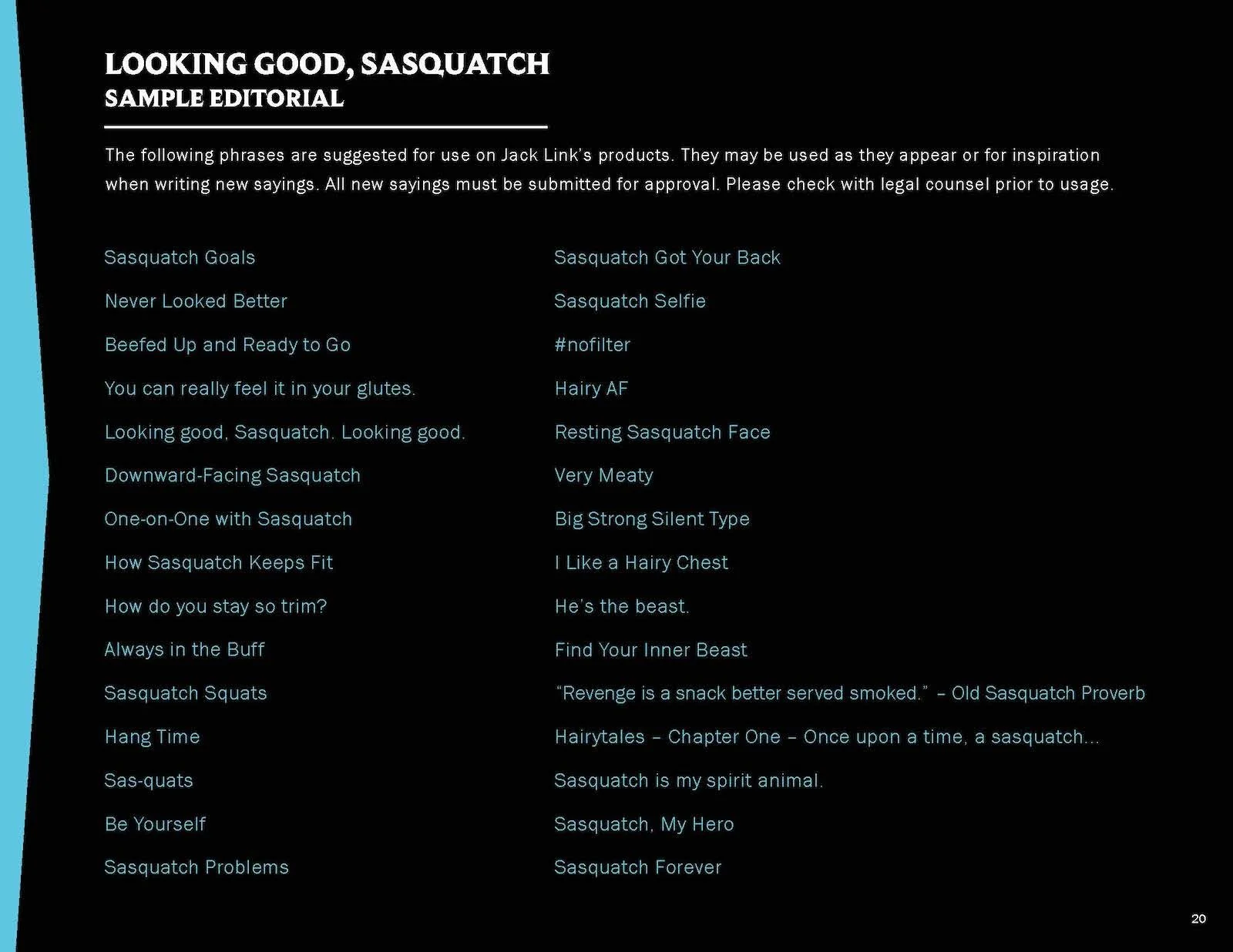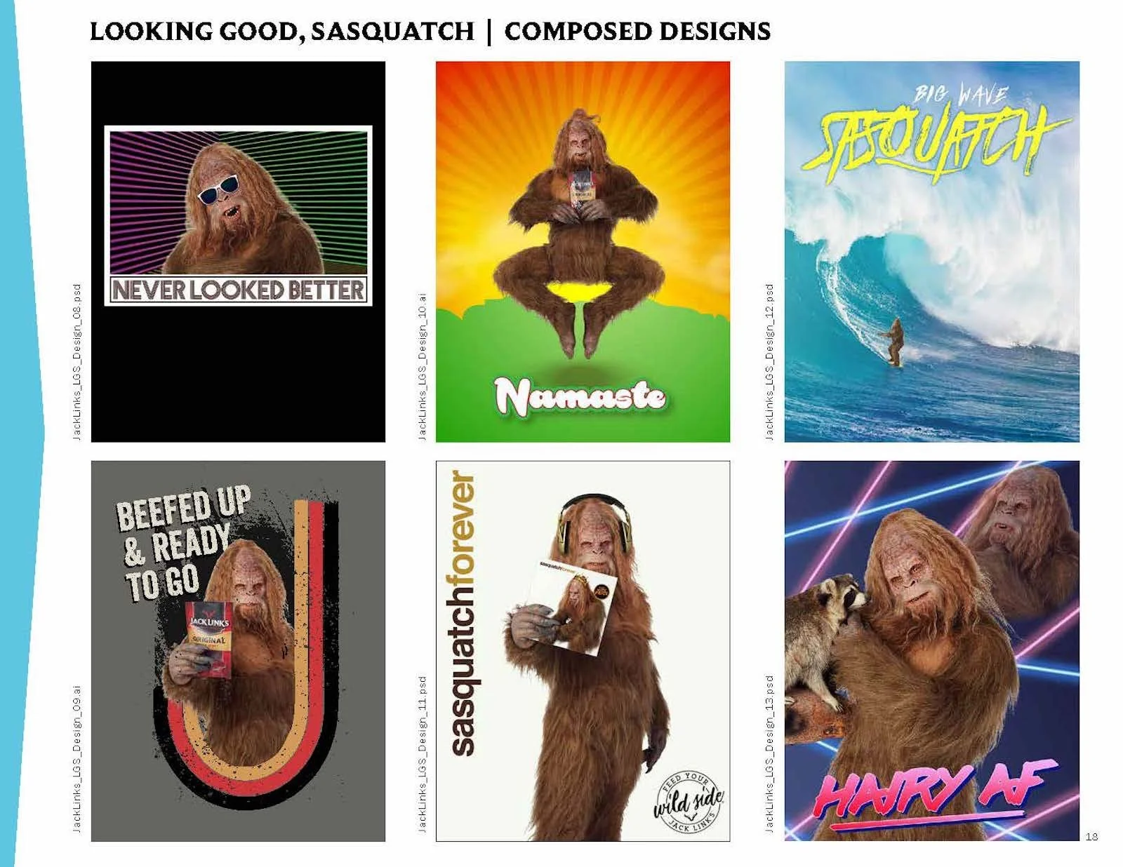 Once in a while a project comes along that calls for getting a little… weird. StyleWorks developed a licensing style guide for Jack Link’s that contained two trend collections, one an outdoor trend and the other building on the popular “Workin’ Out with Sasquatch” ad campaign. In addition to the guide copy and trend descriptions, I had a chance to dream up a variety of humorous slogans to complement the brand’s traditional tagline of “Feed Your Wild Side.”